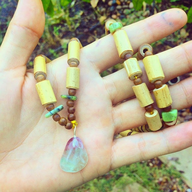 Using the dried bamboo fencing, I cut up each individual bead, I then filed, and sanded it to a smooth, round edge. After making about 50 - 60 bamboo beads, I added the dreamy gemstone of Jade and other wood components, as well as a lovely Flourite piece (which came home with me from my most recent trip to Europe, in Amsterdam!) .... and this beautiful piece was born.