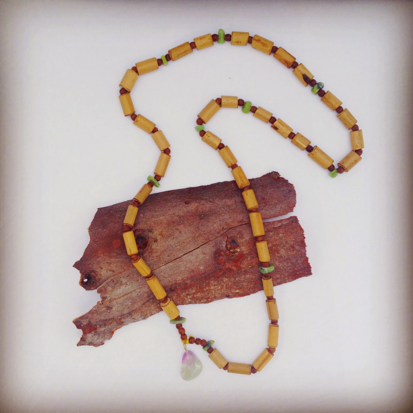 Using the dried bamboo fencing, I cut up each individual bead, I then filed, and sanded it to a smooth, round edge. After making about 50 - 60 bamboo beads, I added the dreamy gemstone of Jade and other wood components, as well as a lovely Flourite piece (which came home with me from my most recent trip to Europe, in Amsterdam!) .... and this beautiful piece was born.