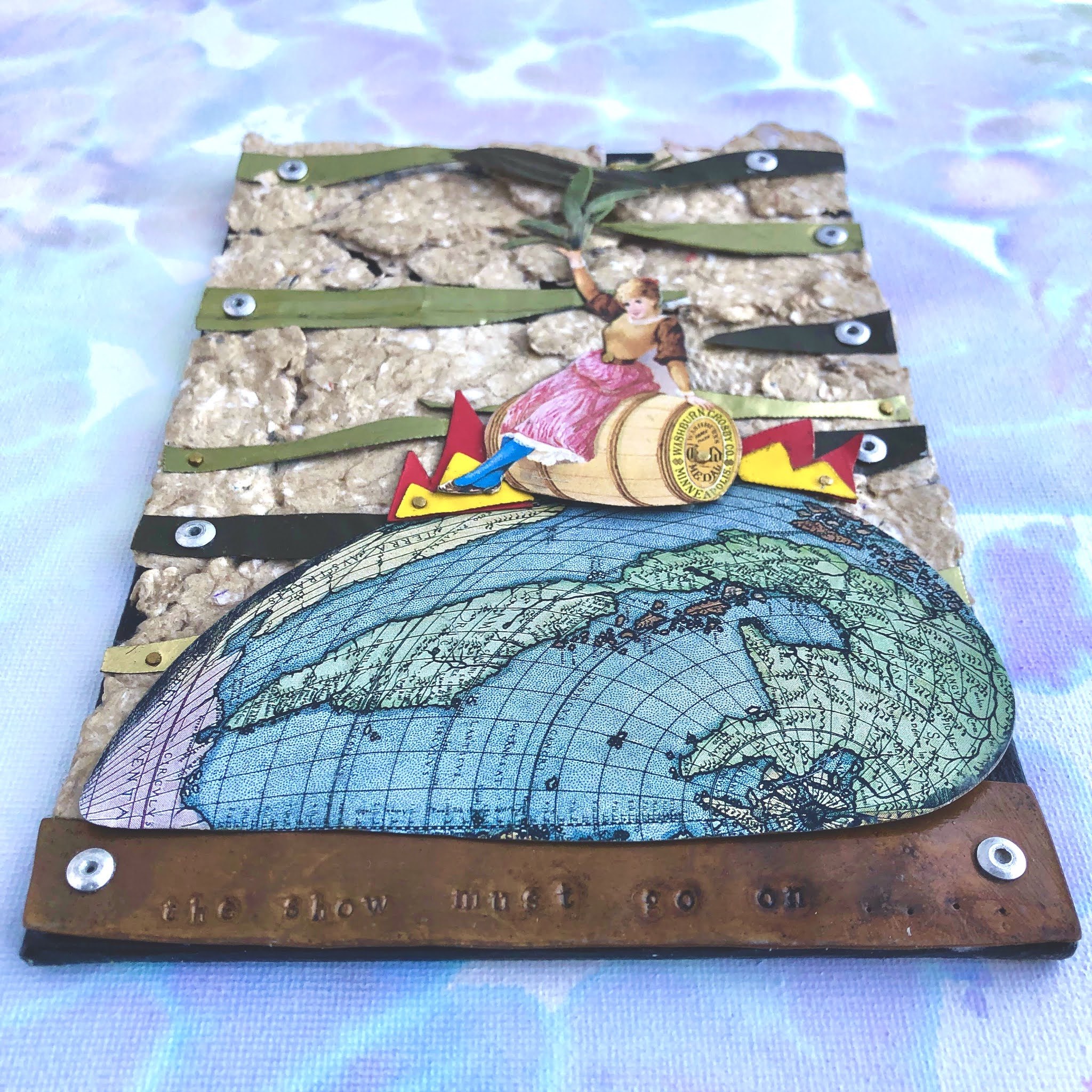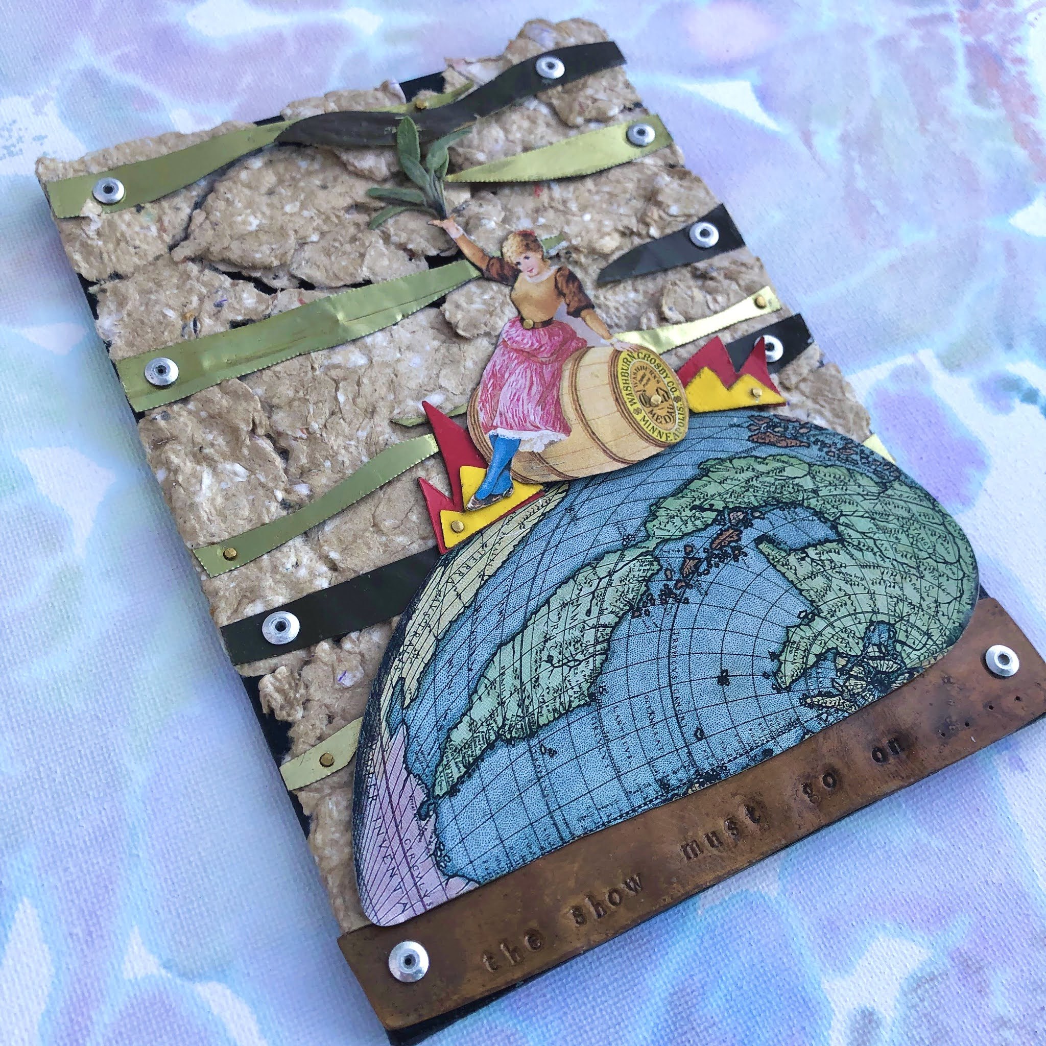Collaged+built using mixed materials: scrap metal, recycled tin, handmade paper, plant material, paint
