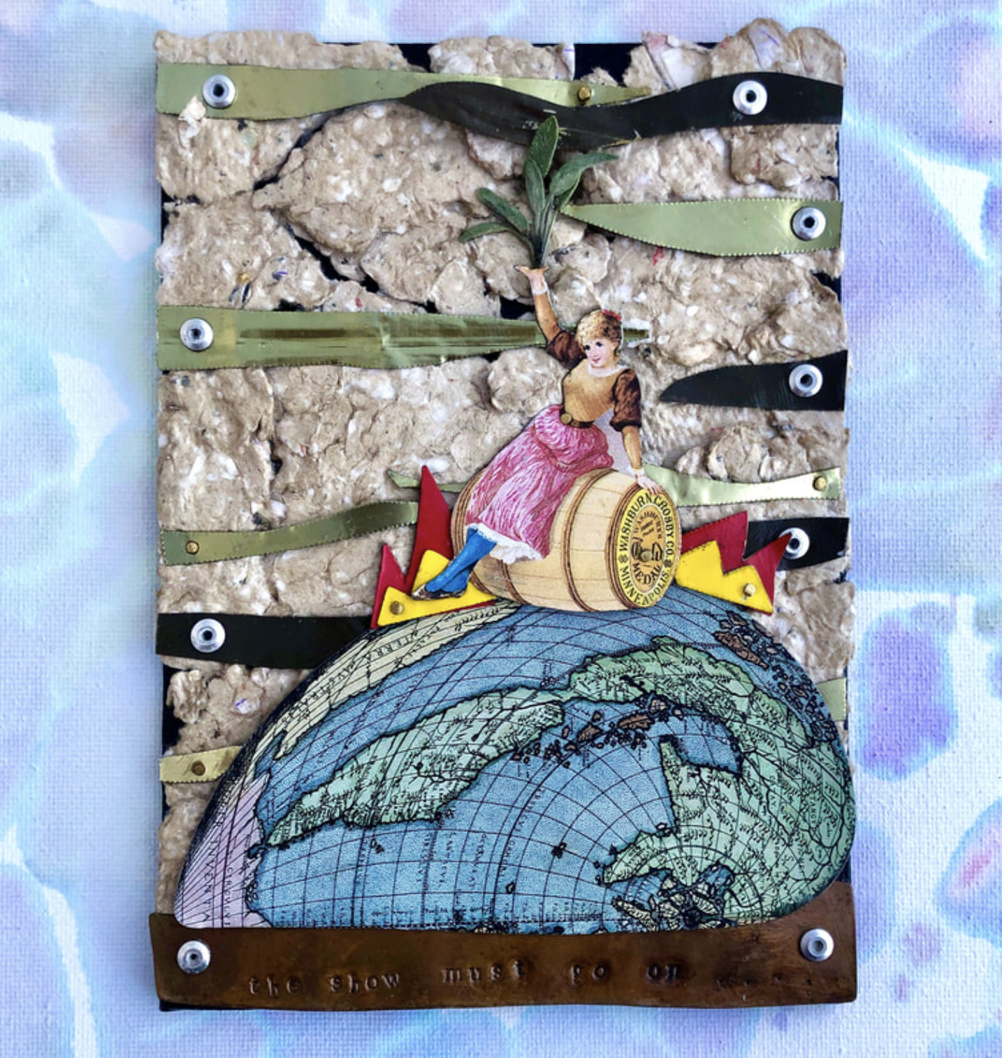 Collaged+built using mixed materials: scrap metal, recycled tin, handmade paper, plant material, paint